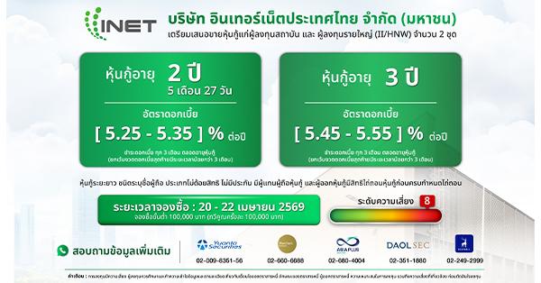 มิติหุ้น – บมจ.อินเทอร์เน็ตประเทศไทย หรือ INET เดินหน้ายุทธศาสตร์ปี 2569 ตอกย้ำบทบาท Sovereign Provider ของประเทศไทย โดยมีคุณมรกต กุลธรรมโยธิน กรรมการผู้จัดการ INET เป็นแม่ทัพสำคัญในการผลักดันยุทธศาสตร์ดังกล่าว เร่งเตรียมความพร้อมด้านเงินทุนในโครงสร้างพื้นฐานสำคัญอย่าง Data Center แห่งที่ 4 (INET-IDC4) ผ่านการเสนอขายหุ้นกู้ครั้งที่ 2/2569 จำนวน 2 ชุด แก่นักลงทุนรายใหญ่ และนักลงทุนสถาบัน โดยหุ้นกู้ชุดที่ 1 รุ่น INET28OA อายุ 2 ปี 5 เดือน 27 วัน ครบกำหนดไถ่ถอนปี 2571 อัตราดอกเบี้ยคงที่ [5.25-5.35] % ต่อปี จ่ายดอกเบี้ยทุก 3 เดือน และหุ้นกู้ชุดที่ 2 รุ่น INET294A อายุ 3 ปี ครบกำหนดไถ่ถอนปี 2572 อัตราดอกเบี้ยคงที่ [5.45-5.55] % ต่อปี จ่ายดอกเบี้ยทุก 3 เดือน ราคาเสนอขายหน่วยละ 1,000 บาท จองซื้อขั้นต่ำ 100,000 บาท และทวีคูณครั้งละ 100,000 บาท เปิดจองซื้อระหว่างวันที่ 20-22 เมษายน 2569 ผ่านผู้จัดการการจัดจำหน่ายหุ้นกู้ 5 แห่ง ได้แก่ บริษัทหลักทรัพย์ หยวนต้า (ประเทศไทย) จำกัด, บริษัทหลักทรัพย์ ดาโอ (ประเทศไทย) จำกัด (มหาชน), บริษัทหลักทรัพย์ บลูเบลล์ จำกัด, บริษัทหลักทรัพย์ เมอร์ชั่น พาร์ทเนอร์ จำกัด (มหาชน), บริษัทหลักทรัพย์ เอเซีย พลัส จำกัด
