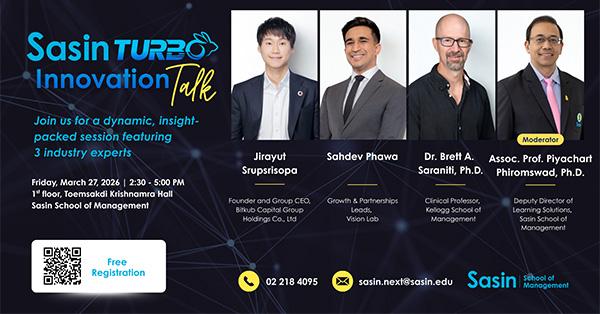 Sasin Turbo Innovation Talk เหมาะสำหรับผู้บริหาร ผู้ประกอบการ นิสิตนักศึกษา และบุคคลทั่วไปที่สนใจ เพื่อเปิดมุมมองใหม่เกี่ยวกับการขับเคลื่อนธุรกิจให้เติบโต การปรับตัวขององค์กร และการพัฒนาภาวะผู้นำด้วยนวัตกรรม