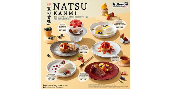สำหรับโปรโมชัน “Natsu Kanmi” สึโบฮาจิได้คัดสรรวัตถุดิบคุณภาพและผลไม้ตามฤดูกาล นำมาเนรมิตเป็นเมนูของหวาน 6 สไตล์ที่โดดเด่นทั้งรูปลักษณ์และรสชาติอันพิถีพิถัน ประกอบด้วย: