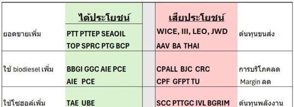 กลุ่มรับอานิสงส์บวก คือมักจะเป็นกลุ่มผู้ขายน้ำมัน เพราะการบริโภคจะเพิ่มขึ้น เพราะกังวลว่าราคาจะปรับเพิ่มขึ้นอีก ซึ่งได้ประโยชน์โดยตรงจากผู้ผลิต เช่นกลุ่ม PTT รวมถึงโรงกลั่น เช่น TOP รวมทั้งกลุ่มผู้ผลิตไบโอดีเซล และก๊าซโซฮอล์ และกลุ่มผลิตน้ำมันปาล์มดิบ ได้ประโยชน์เช่น CPI VPO APO UVAN PCE เป็นต้น