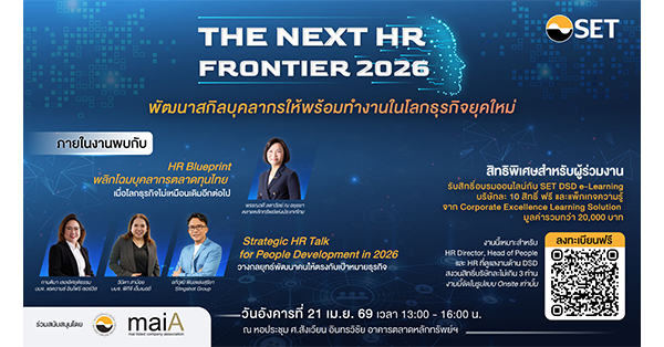 นอกจากนี้ ผู้เข้าร่วมงานยังได้รับสิทธิพิเศษอบรมออนไลน์กับ SET DSD e-Learning ฟรี บริษัทละ 10 สิทธิ์ และแพ็กเกจความรู้จาก Corporate Excellence Learning Solution มูลค่ารวมกว่า 20,000 บาท ลงทะเบียนฟรี ได้ตั้งแต่วันนี้ ถึง 17 เมษายน 2569 ที่ https://set-event-registration.setgroup.or.th/e/the-next-hr-frontier-2026 หรือสอบถาม SET Contact Center 0 2009 9999