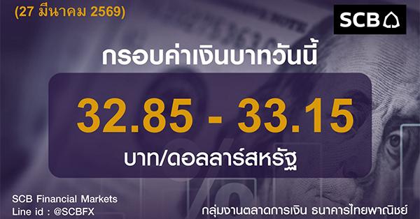 - กลุ่มงานตลาดการเงิน ธนาคารไทยพาณิชย์ ประเมินค่าเงินบาทวันนี้เคลื่อนไหวในกรอบ 32.85-33.15 บาท/ดอลลาร์