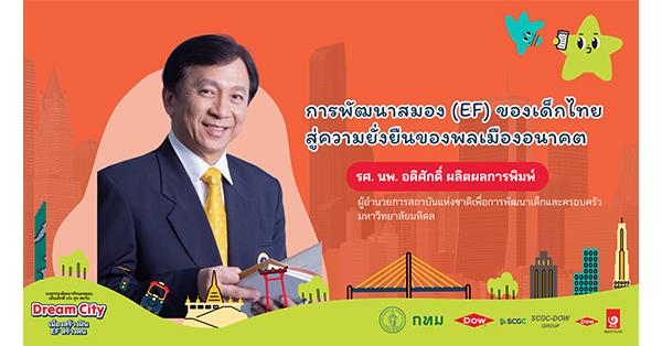 นี่คือประเด็นสำคัญจากการบรรยายหัวข้อ “การพัฒนาสมอง (EF) ของเด็กไทย สู่ความยั่งยืนของพลเมืองอนาคต” โดย รศ. นพ. อดิศักดิ์ ผลิตผลการพิมพ์ ผู้อำนวยการสถาบันแห่งชาติเพื่อการพัฒนาเด็กและครอบครัว มหาวิทยาลัยมหิดล ภายในงาน “ดรีมซิตี้ เมืองสร้างฝัน อีเอฟสร้างคน” ซึ่งจัดขึ้นโดยความร่วมมือของ กลุ่มบริษัท ดาว ประเทศไทย (Dow) กรุงเทพมหานคร สถาบันรักลูก เลิร์นนิ่ง กรุ๊ป (RLG) และพันธมิตร เพื่อสะท้อนภาพการหล่อหลอมเยาวชนไทยให้เติบโตอย่างมีคุณภาพ