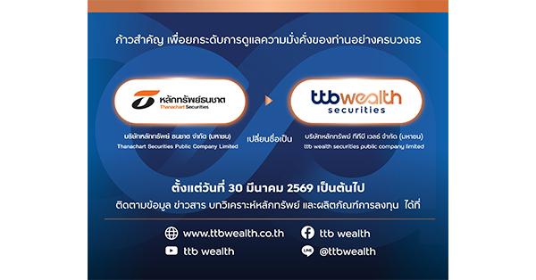 TTBWEALTH เพื่อสะท้อนทิศทางการดำเนินธุรกิจด้านการลงทุนและการบริหารความมั่งคั่ง ภายใต้กลุ่มทีทีบีอย่างชัดเจน ทั้งนี้ ลูกค้าและผู้สนใจสามารถติดตามข้อมูล ข่าวสาร บทวิเคราะห์หลักทรัพย์ และผลิตภัณฑ์การลงทุน ได้ทุกช่องทางการสื่อสารของบริษัทในชื่อ ttb wealth ตั้งแต่วันที่ 30 มีนาคม 2569 เป็นต้นไป