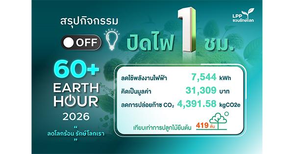 กิจกรรม 60+ Earth Hour 2026 จัดขึ้นเมื่อวันเสาร์ที่ 28 มีนาคมที่ผ่านมา ในช่วงเวลา 20.30 – 21.30 น.และผลลัพธ์จากการจัดกิจกรรมนั้น LPP ได้รวบรวมตัวเลขผลสรุปจากทุกโครงการที่เข้าร่วมเพื่อสะท้อนความร่วมมืออันแข็งแกร่ง โดยมีโครงการที่บริหารจัดการกว่า 76% พร้อมใจกันปรับเปลี่ยนพฤติกรรมเพื่อโลก ซึ่งถือเป็นผลลัพธ์ของความร่วมมือที่ดีขึ้นอย่างต่อเนื่อง โดยมีข้อมูลผลลัพธ์ปีนี้ ดังนี้