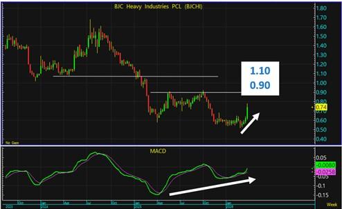 กราฟ BJCHI เริ่มฟื้นตัวขึ้นจากแนวต่ำสุด โดยกราฟมีโครงสร้างเป็นถ้วยหงาย มีแนวต้านแรก 0.90 บาท และมีโอกาสไปถึง 1.10 บาท ขณะที่ MACD มีสัญญาณซื้อที่แข็งแกร่ง สนับสนุนให้กราฟปรับขึ้นในระยะกลาง
