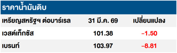 (-) ราคาน้ำมันดิบปรับลด หลังมีรายงานข่าวที่ไม่ได้รับการยืนยันว่าประธานาธิบดีอิหร่านพร้อมเจรจาเพื่อที่ยุติสงคราม ภายใต้เงื่อนไขหลักประกันที่ชัดเจน ได้แก่ การรับประกันว่าจะไม่มีการโจมตีซ้ำ, การคุ้มครองผลประโยชน์ของประชาชนอิหร่าน และ การชดใช้ค่าเสียหาย โดยการแถลงการณ์ดังกล่าวนับเป็นสัญญาณเชิงบวกครั้งสำคัญท่ามกลางสถานการณ์ความตึงเครียดในภูมิภาคตะวันออกกลางที่ยืดเยื้อมาเป็นเวลานาน