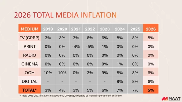 สำหรับแนวโน้ม Inflation ของตลาดมีเดียโดยรวมในปี 2569 อยู่ที่ 5% โดย TV จะมี CPRP Inflation ที่ 5% ขณะที่ OOH และ Digital อยู่ที่ 6% ตามลำดับ