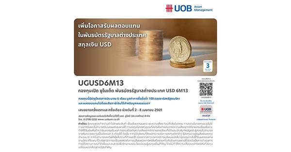 มิติหุ้น – บริษัทหลักทรัพย์จัดการกองทุน ยูโอบี (ประเทศไทย) จำกัด หรือ บลจ.ยูโอบี ได้เสนอขายหน่วยลงทุนครั้งแรก (IPO) กองทุนเปิด ยูไนเต็ด พันธบัตรรัฐบาลต่างประเทศ USD 6M13 (UGUSD6M13) อายุประมาณ 6 เดือน มีประมาณการผลตอบแทน 3.35% ต่อปี(ข้อมูลจากอัตราผลตอบแทนที่เสนอโดยผู้ออกตราสาร หรือจากผู้ขาย ณ วันที่ 30 มีนาคม 2569) กองทุนมีขนาดโครงการ 200 ล้านดอลลาร์สหรัฐ โดยเสนอขายในราคา 10 ดอลลาร์สหรัฐต่อหน่วย และยอดลงทุนครั้งแรกขั้นต่ำ 100 ดอลลาร์สหรัฐ