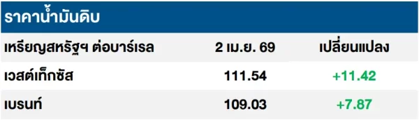 (+) ราคาน้ำมันดิบเวสต์เท็กซัสและเบรนท์ปรับเพิ่มขึ้น หลังประธานาธิบดีสหรัฐฯ โดนัลด์ ทรัมป์ ประกาศว่าจะยกระดับการโจมตีอิหร่านอย่างรุนแรงในช่วง 2–3 สัปดาห์ข้างหน้า และหากการเจรจาไม่คืบหน้า สหรัฐฯ จะเดินหน้าโจมตีโครงสร้างพื้นฐานด้านการผลิตไฟฟ้าและน้ำมันของอิหร่าน พร้อมยืนยันว่ากองทัพสหรัฐฯ ใกล้บรรลุเป้าหมายแล้ว แต่ยังไม่ระบุกรอบเวลาที่ชัดเจนในการยุติสงคราม ซึ่งยืดเยื้อมานานกว่า 1 เดือน รวมถึงไม่มีการเปิดเผยรายละเอียดเกี่ยวกับขั้นตอนที่อาจนำไปสู่การเปิดช่องแคบฮอร์มุซอีกครั้ง ส่งผลให้ตลาดกังวลเกี่ยวกับการหยุดชะงักของอุปทานน้ำมันในระยะยาว