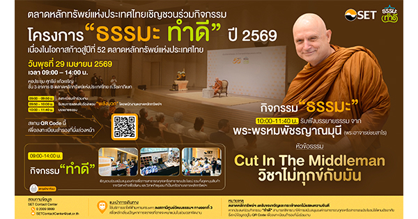 มิติหุ้น – ตลาดหลักทรัพย์แห่งประเทศไทย ชวนผู้ลงทุน ประชาชน และผู้สนใจร่วมกิจกรรมโครงการ “ธรรมะ ทำดี ปี 2569” เนื่องในโอกาสก้าวสู่ปีที่ 52 ตลาดหลักทรัพย์ฯ กำหนดจัดขึ้นในวันพุธที่ 29 เมษายน 2569 เวลา 09.00 – 14.00 น. ณ อาคารตลาดหลักทรัพย์ฯ โดยแบ่งเป็น 2 กิจกรรม ได้แก่