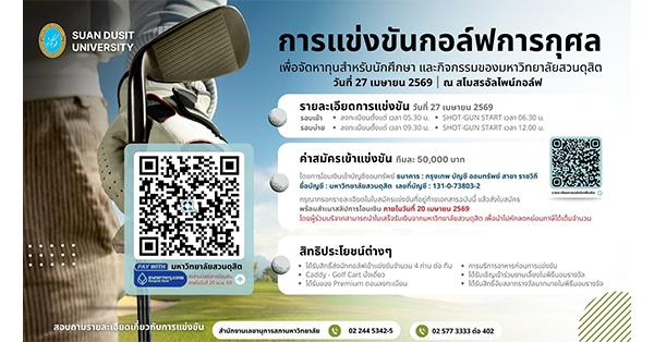 มิติหุ้น – มหาวิทยาลัยสวนดุสิต ขอเชิญผู้รักกีฬากอล์ฟทุกท่าน ร่วมสัมผัสประสบการณ์การออกรอบสุดเอ็กซ์คลูซีฟ ในโครงการ Flagship Project Power of Giving” กิจกรรมที่จัดขึ้นเพื่อสร้างและกระชับความสัมพันธ์ระหว่างเครือข่ายของมหาวิทยาลัย ศิษย์เก่า ภาคธุรกิจ พันธมิตรต่าง ๆ และผู้มีจิตศรัทธา พร้อมทั้งส่งเสริมภาพลักษณ์และบทบาทของมหาวิทยาลัยสวนดุสิตในการอุทิศตนเพื่อสังคม ตลอดจนร่วมระดมทุนสนับสนุนกิจกรรมด้านการศึกษาและการพัฒนาศักยภาพนักศึกษาให้มีความพร้อมสู่เส้นทางวิชาชีพอย่างมั่นคง