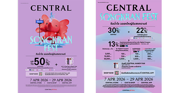 ชวนอัปเดตเทรนด์หน้าร้อนและสนุกกับการช้อปในแคมเปญ “CENTRAL SONGKRAN FEST” ตั้งแต่วันที่ 7–29 เมษายน 2569 ที่คัดสรรสินค้าใหม่ คอลเลกชันล่าสุด และไอเทมเด่นจากหมวดบิวตี้และแฟชั่น พร้อมข้อเสนอพิเศษตลอดแคมเปญ และเพลิดเพลินไปกับกิจกรรมสงกรานต์ที่ช่วยเติมบรรยากาศแห่งความสุขของทุกครอบครัว ได้ที่ห้างเซ็นทรัลทุกสาขา เซ็นทรัลแอป และทุกช่องทางการช้อป ทั้งเว็บไซต์ www.central.co.th, Central Chat & Shop ช้อปและแชตผ่านไลน์ @Centralofficial รวมถึงช้อปผ่านเฟซบุ๊กที่ Facebook page: Central Department Store