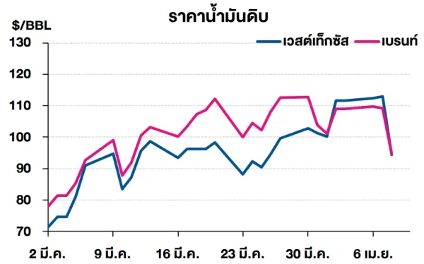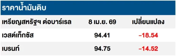 (-) ราคาน้ำมันดิบปรับลดลง หลังสหรัฐฯ และอิหร่านได้บรรลุข้อตกลงที่จะหยุดยิงเป็นเวลา 2 สัปดาห์ โดยนายโดนัลด์ ทรัมป์ ประธานาธิบดีสหรัฐฯ ระบุว่าสหรัฐฯ จะระงับการโจมตีต่ออิหร่านเป็นระยะเวลา 2 สัปดาห์เพื่อแลกกับการที่อิหร่านยอมเปิดช่องแคบฮอร์มุซ โดยคำกล่าวของผู้นำสหรัฐฯ สอดคล้องกับแถลงการณ์ของรัฐมนตรีต่างประเทศของอิหร่าน ซึ่งระบุว่าจะมีการเปิดช่องแคบฮอร์มุซให้สามารถเดินเรือได้อย่างปลอดภัยเป็นระยะเวลา 2 สัปดาห์เช่นกัน ขณะที่อิสราเอลประกาศสนับสนุนท่าทีของรัฐบาลสหรัฐฯ เช่นกัน โดยรองประธานาธิบดีสหรัฐฯ จะเป็นผู้นำคณะผู้แทนสหรัฐฯ ในการเจรจารอบแรกระหว่างสหรัฐฯ และอิหร่าน ซึ่งจะจัดขึ้นในช่วงเช้าของวันเสาร์ ณ กรุงอิสลามาบัด ประเทศปากีสถาน