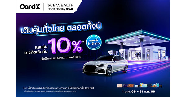 รับเครดิตเงินคืน 10%* เมื่อใช้คะแนน POINTX เท่ายอดใช้จ่าย สำหรับการเติมน้ำมันทุกสถานีทั่วประเทศ ช่วยบริหารค่าใช้จ่ายด้านพลังงานซึ่งเป็นต้นทุนหลักของผู้บริโภค