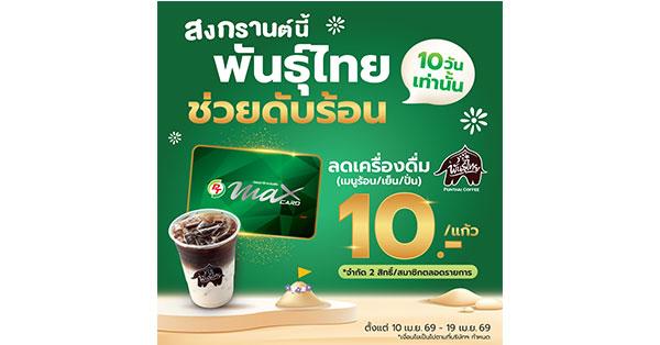 - โปรโมชันมอบส่วนลดพิเศษให้ชาวบัตรเขียว (Max Card Premier) รับส่วนลดทันที 10 บาท/แก้ว ทุกเมนู ทั้งร้อน เย็น และปั่น ตั้งแต่วันที่ 10 เม.ย. 69 – 19 เม.ย. 69 จำกัด 2 สิทธิ์ / สมาชิก ตลอดแคมเปญ ที่ร้านพันธุ์ไทยทุกสาขาที่ร่วมรายการ (ยกเว้นสาขาท่าอากาศยาน และเดลิเวอรี)