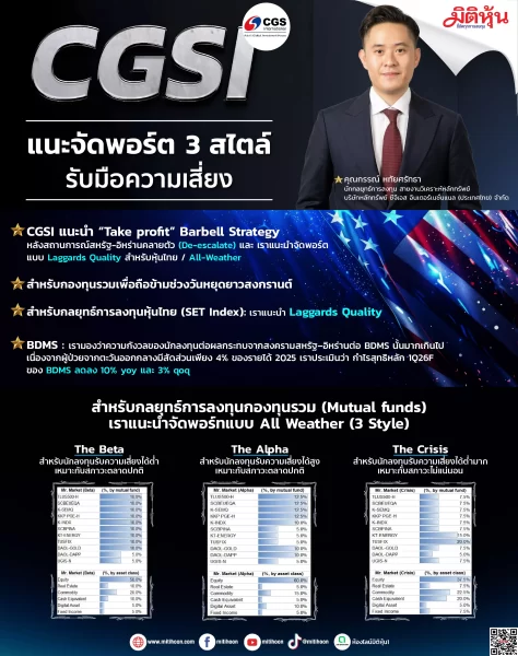 Infographics CGSI แนะจัดพอร์ต 3 สไตล์ รับมือความเสี่ยง 11 เมษายน 2026 / เวลา 09:00 น. 20 แบ่งปัน FacebookXWhatsAppTelegramLINECopy URL