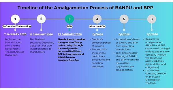 At the EGM on 29 January 2026, shareholders will consider approval of the amalgamation transaction between the Company and BPP, which will be carried out in accordance with the Public Limited Companies Act. If approved and after completion of the relevant procedures, both companies will cease to exist as separate legal entities, and a new public limited company will be formed as a result of the amalgamation. The new company will assume all assets, liabilities, rights, duties, and obligations of both companies by law. Following completion of the amalgamation, the new company will submit an application for the acceptance of its shares as listed securities on the Stock Exchange of Thailand, while the shares of the Company and BPP will be delisted accordingly.